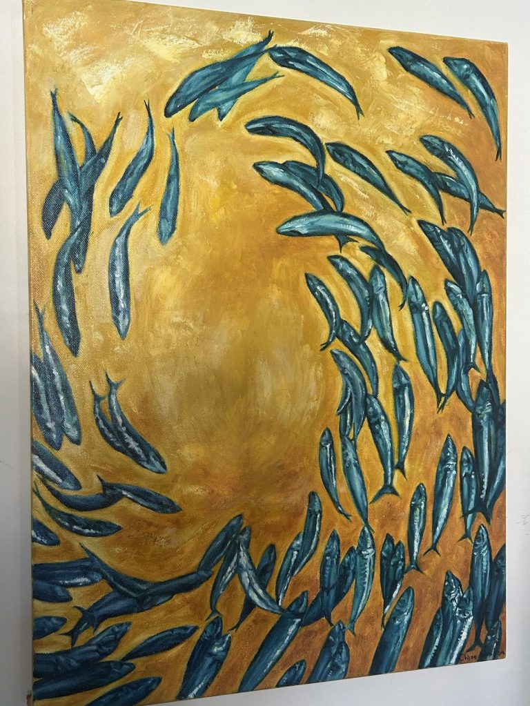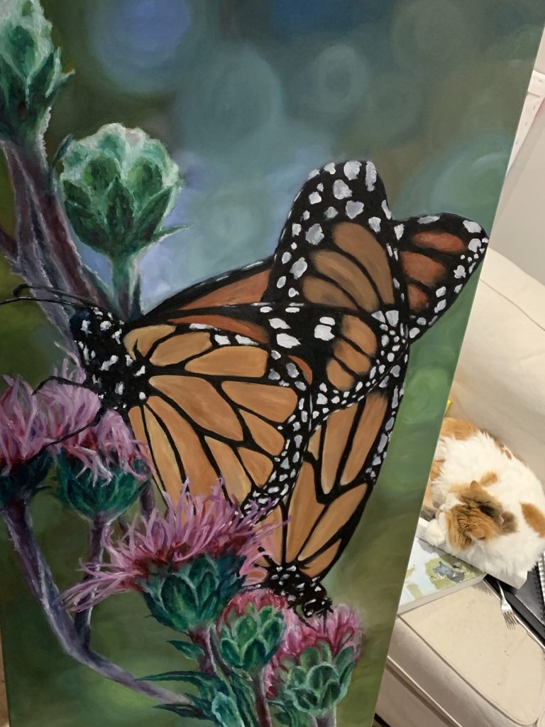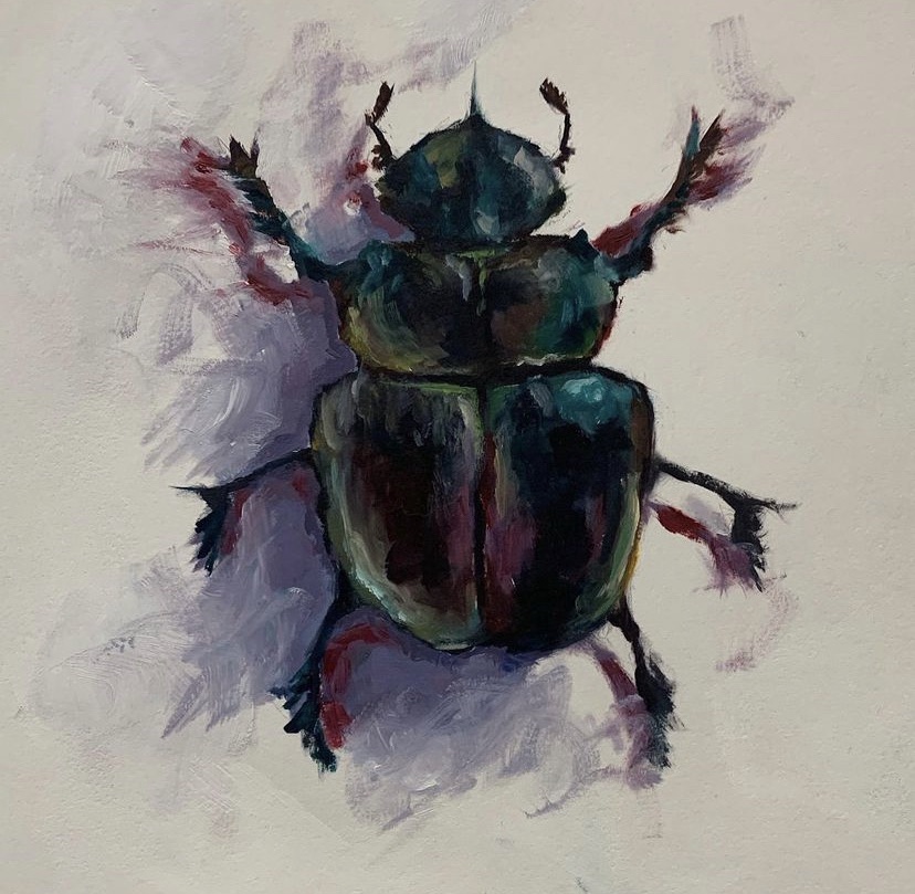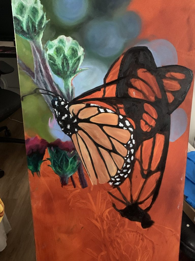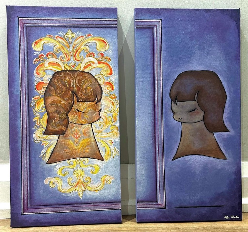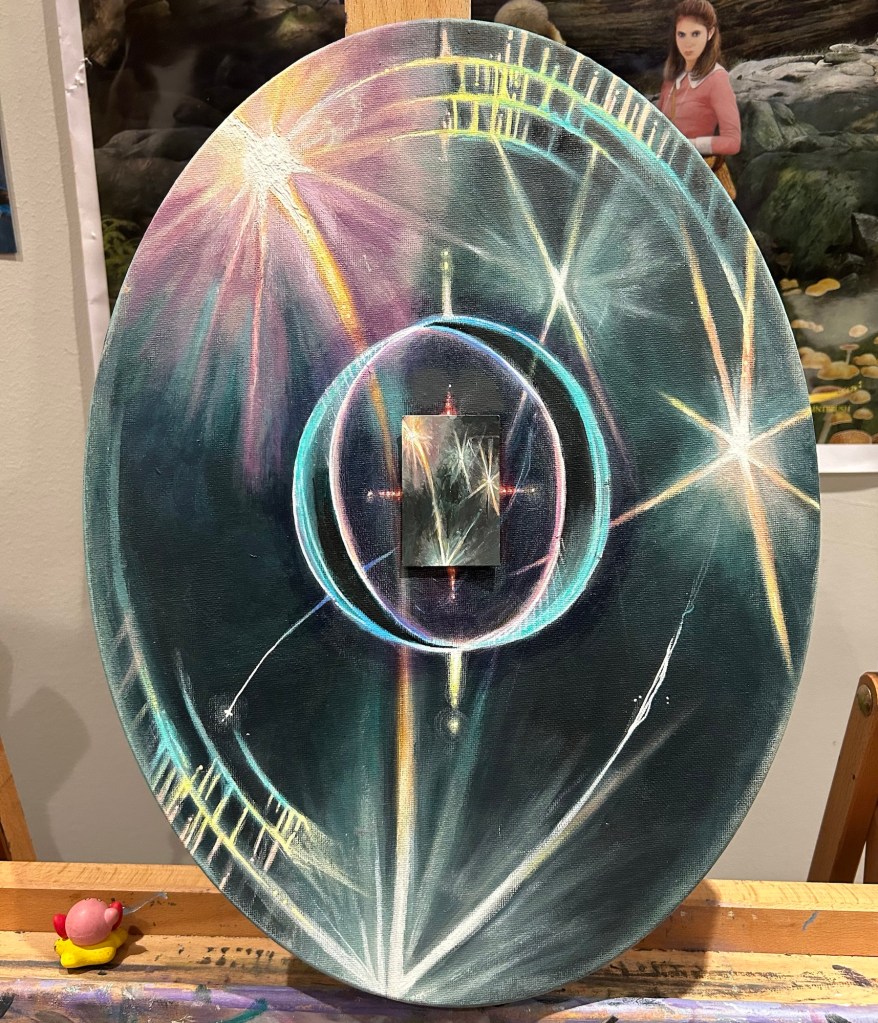 A small piece of metal from the canvas frame poked through when I began. But later, I leaned into it—made it larger, more deliberate. Now it stands out brilliantly, its contrast so striking it feels as though she’s glowing.